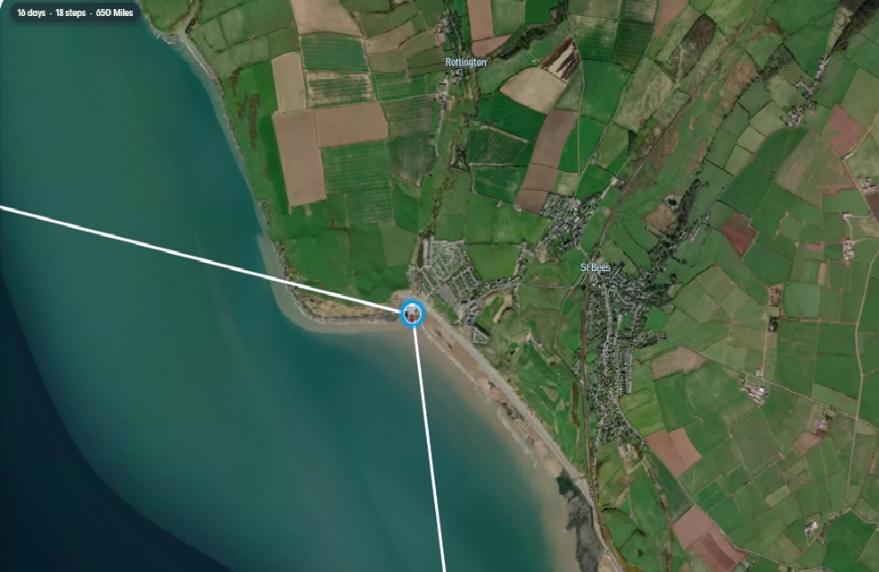 I anchored in the bay of St Bees, and it caught on the first try, holding steady all night. The night was calm and beautiful, and I slept soundly. At 6 a.m., I woke to a quiet scene with little happening around the beach. Thirty years earlier, I had arrived one morning and set off on Wainwright’s Coast to Coast walk.