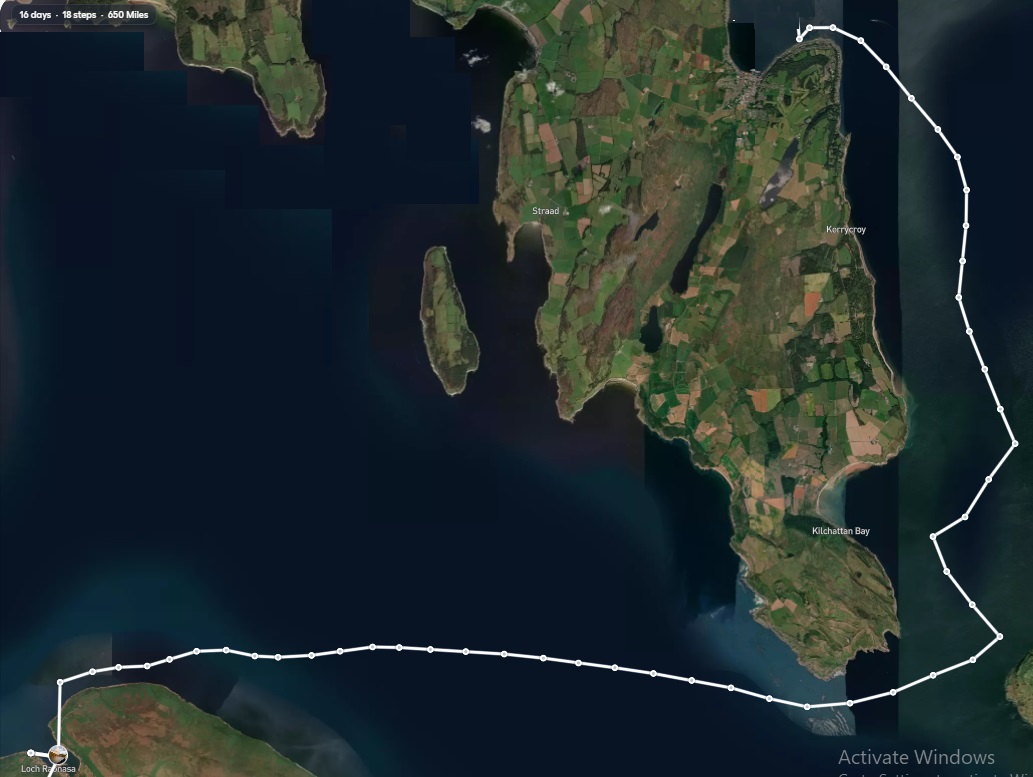 I left St. Bees and headed northwest, passing the Isle of Man on my left and Luce Bay on my right. Before long, the Mull of Galloway appeared on the horizon. With a favourable tide, my boat, Jamila, surged ahead, at times reaching speeds of 8 knots toward the looming cliffs, only to slow to 2 knots due to back eddies. About an hour later, while continuing along the Scottish coast.
