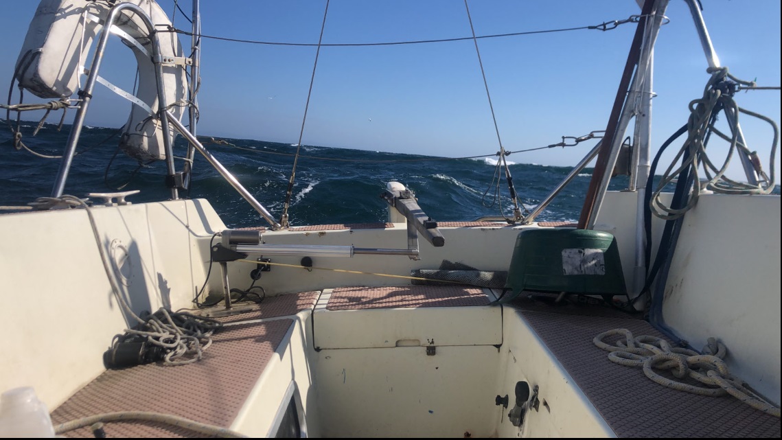 Strong southerly winds, two deep reefs in the mainsail, and enough jib to balance things out.